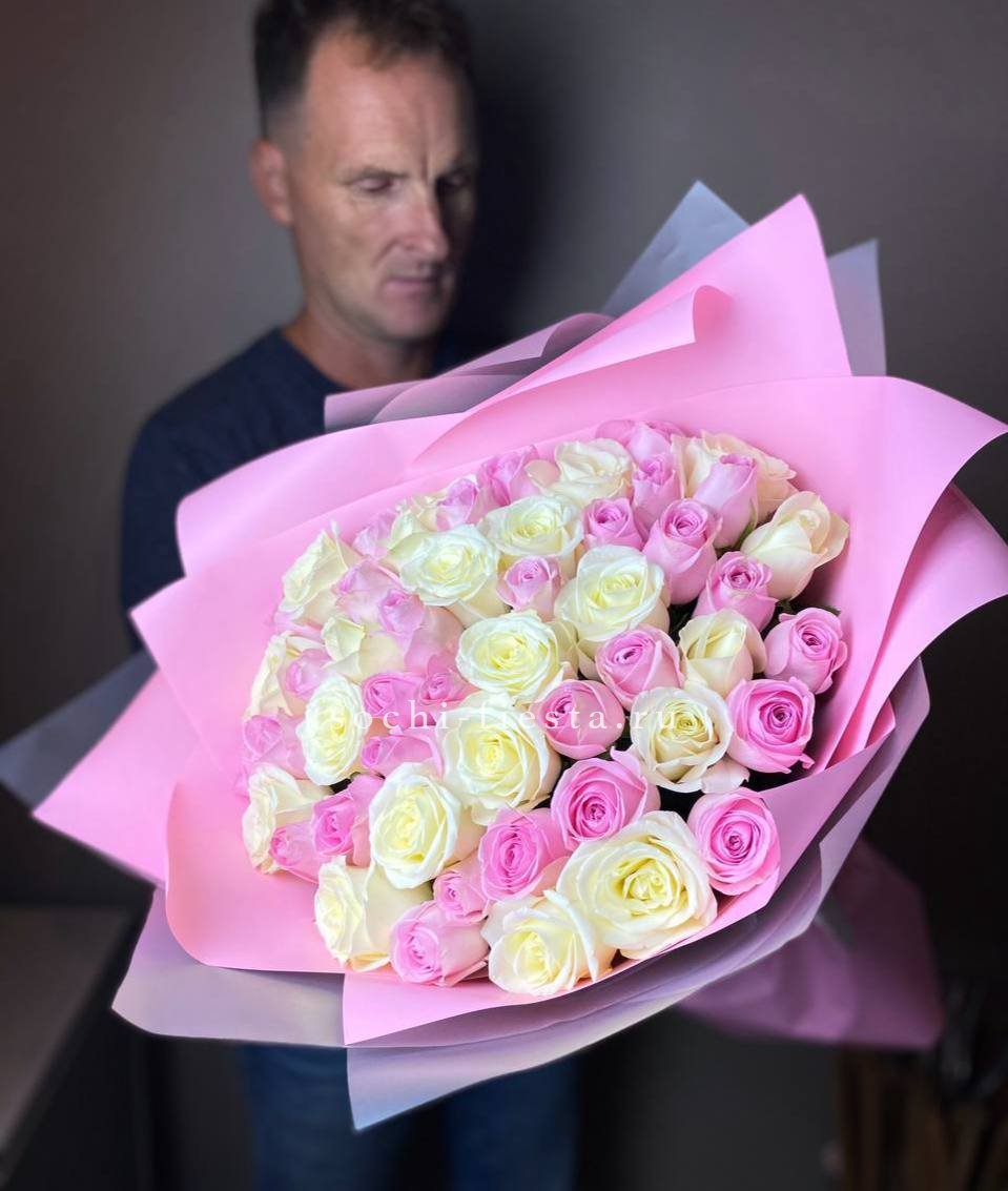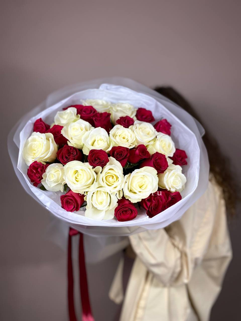 в составе 35 красно-белых роз.