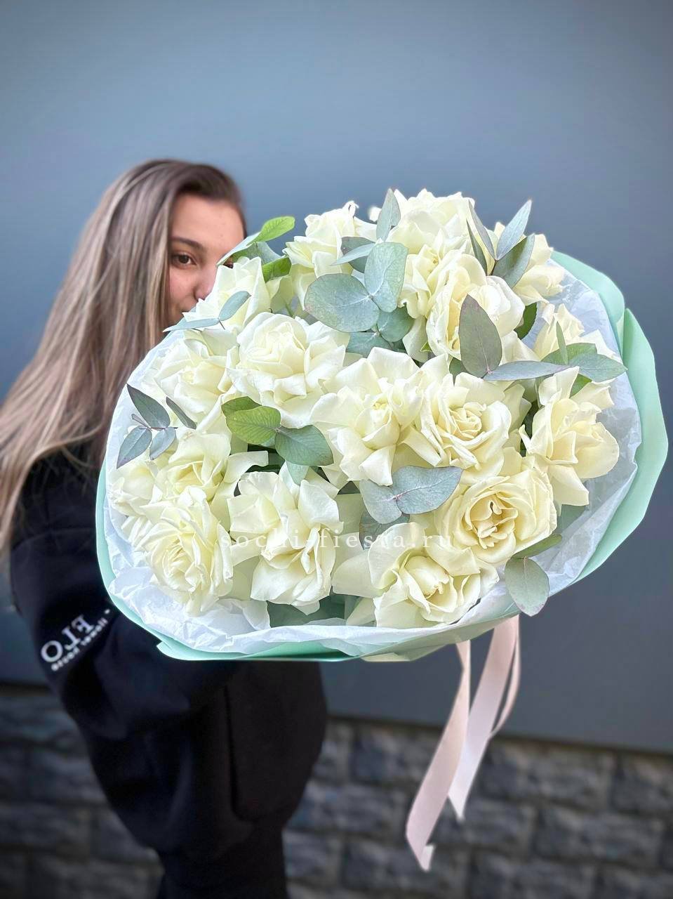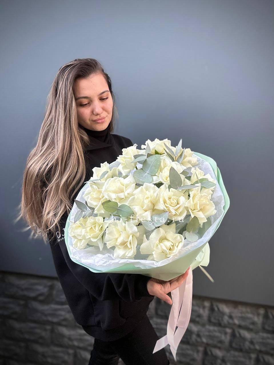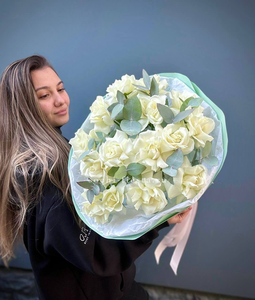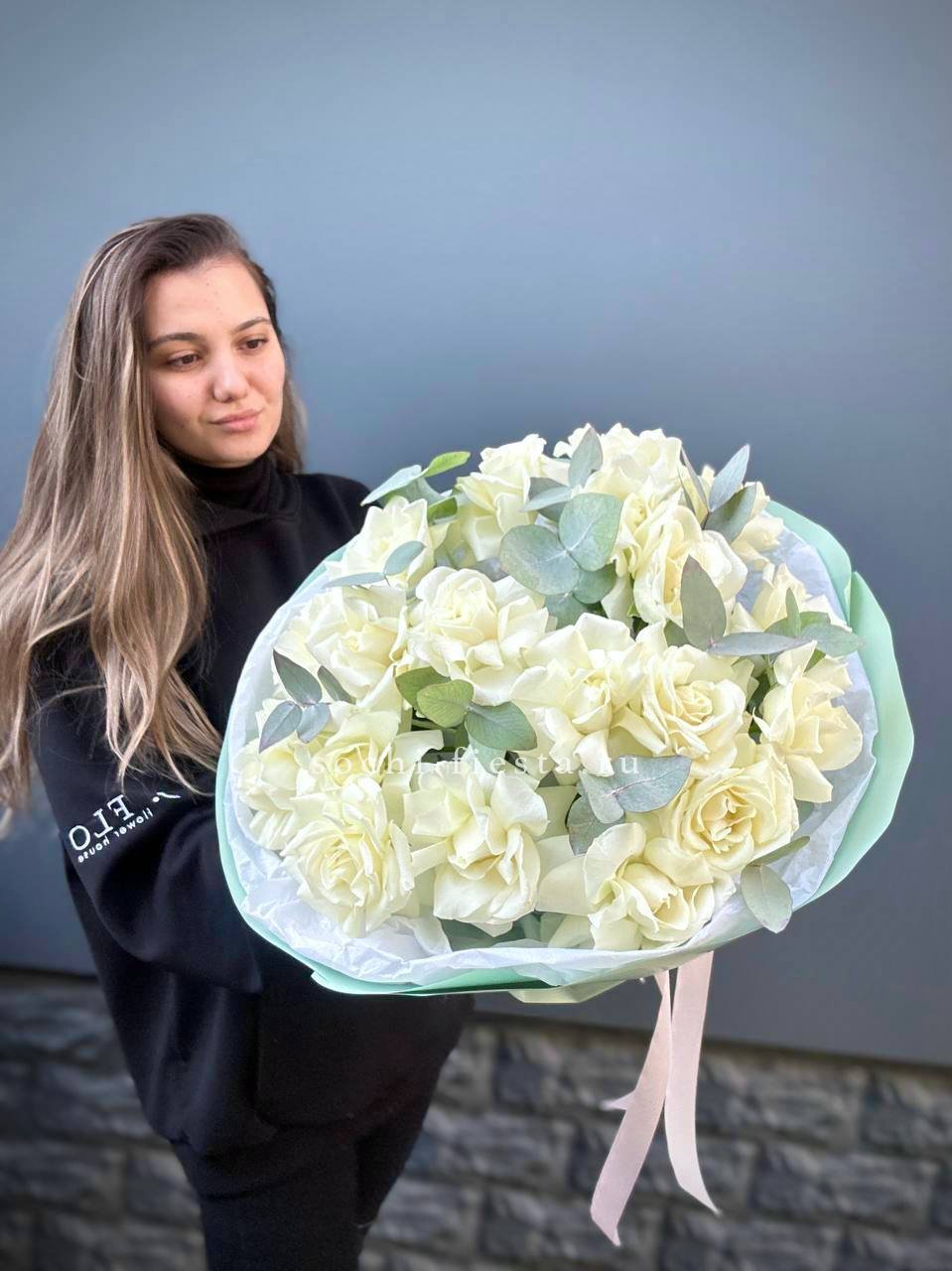 Тринадцать белоснежных бутонов собраны в компактную форму с ровным силуэтом. Букет легко размещается в вазе и сохраняет свежесть долгое время благодаря плотным лепесткам.