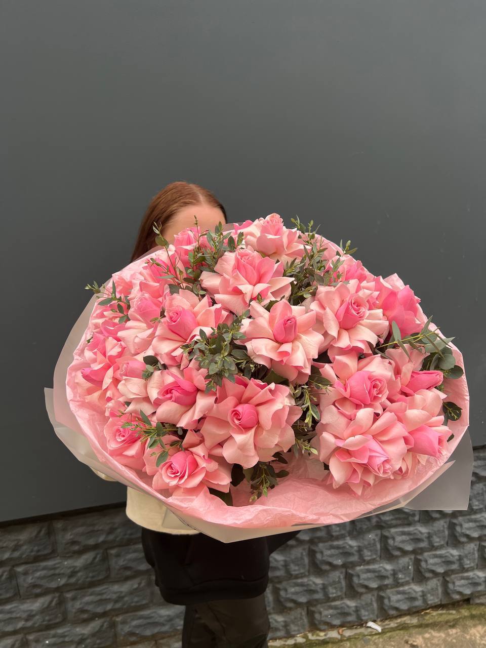 роза розовая - 101 шт., лента, белая дизайнерская бумага.