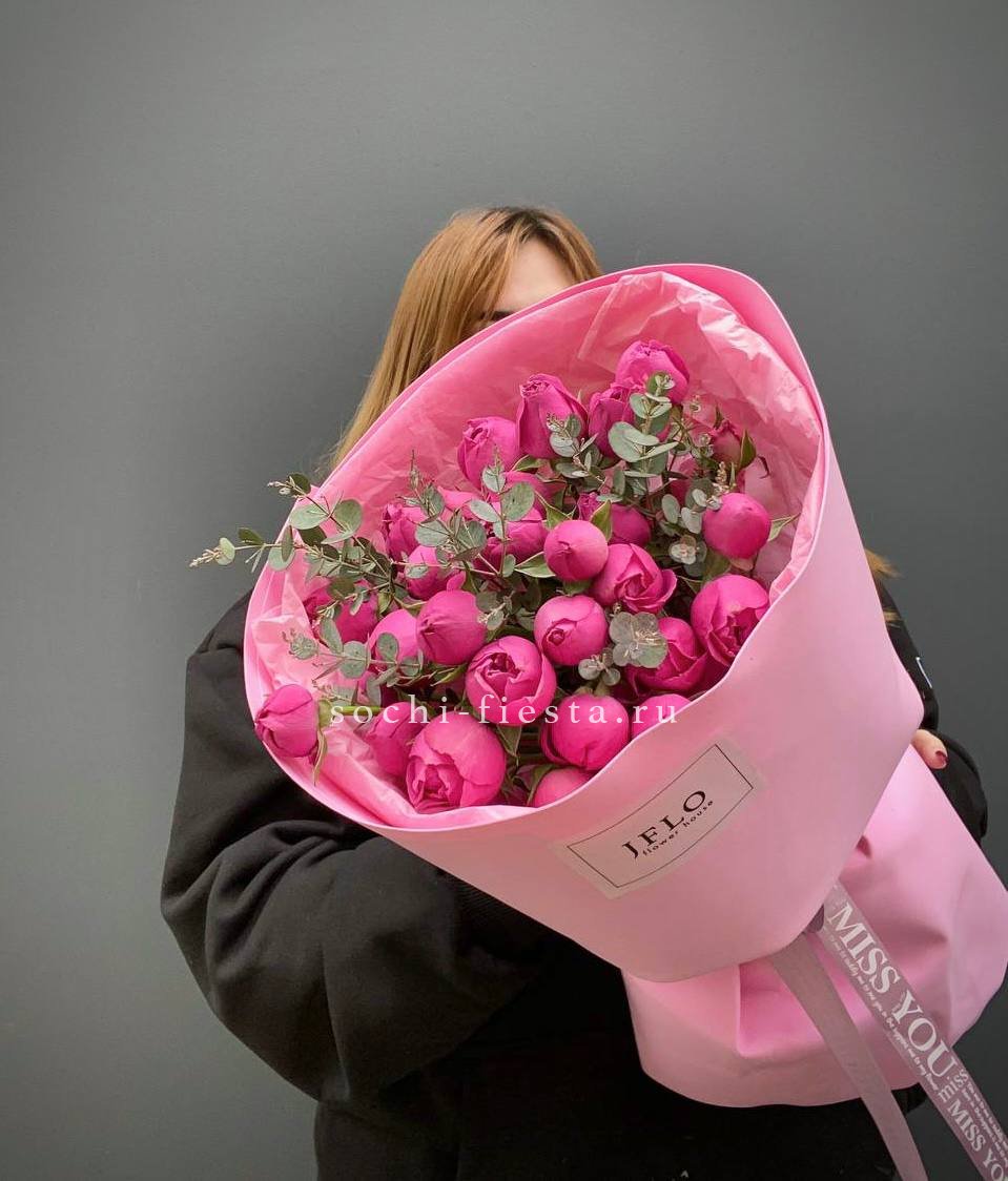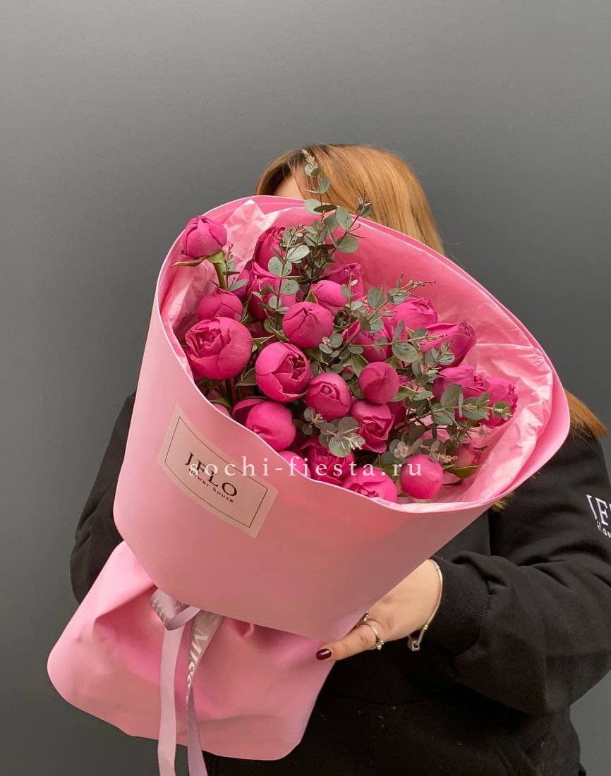 25 пионовидные кустовые розы,  хлопок, лента, дизайнерская упаковка.