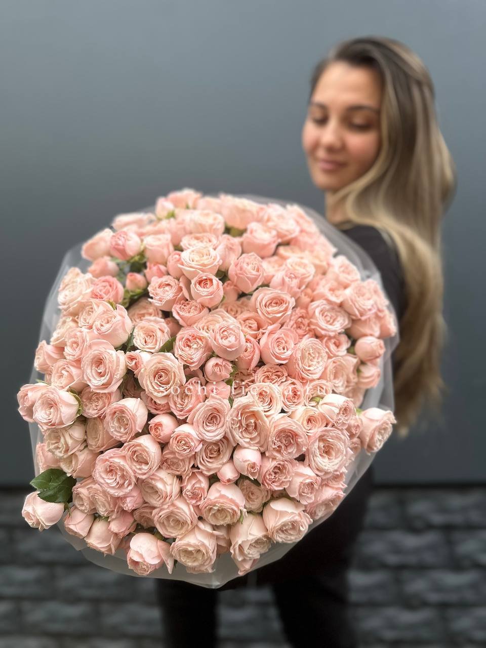 Пятьдесят один бутон сорта Бомбастик с густомахровыми лепестками кремового оттенка. Плотная сборка создает впечатляющий объем и заполняет пространство. Монобукет для тех моментов, когда важен масштаб.