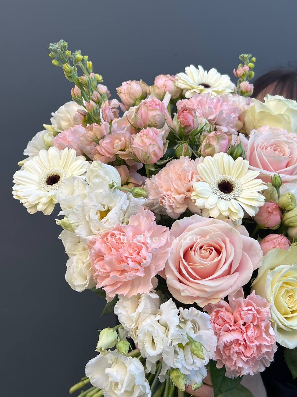 эустома, диантус, гербера, маттиола, бомбастик, розы лента. Состав может меняться в зависимости от сезона.