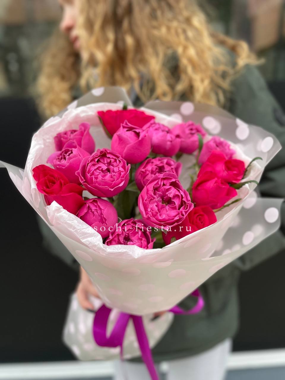 пионовидные кустовые розы мисти бабблс, розовые розы, лента, дизайнерская пленка, тишью.
