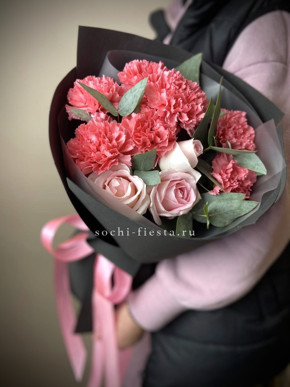 маттиола, розы, гортензия, диантусы, хризантемы , лента и дизайнерская пленка.