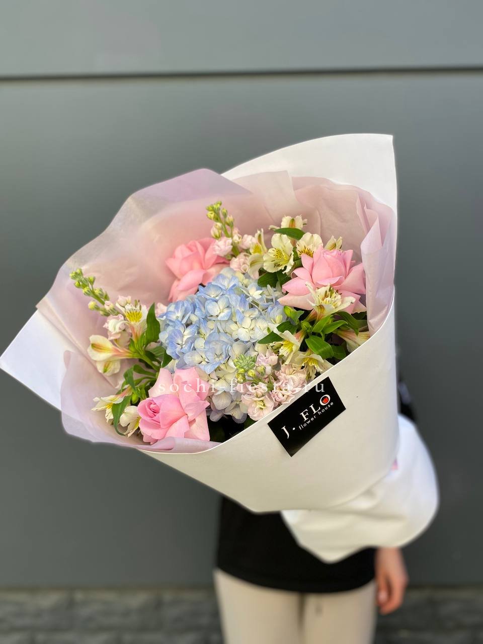 Герберы задают открытый характер букета, розы добавляют мягкости, а гортензия наполняет объёмом. Композиция смотрится свежо и держит форму без усилий.