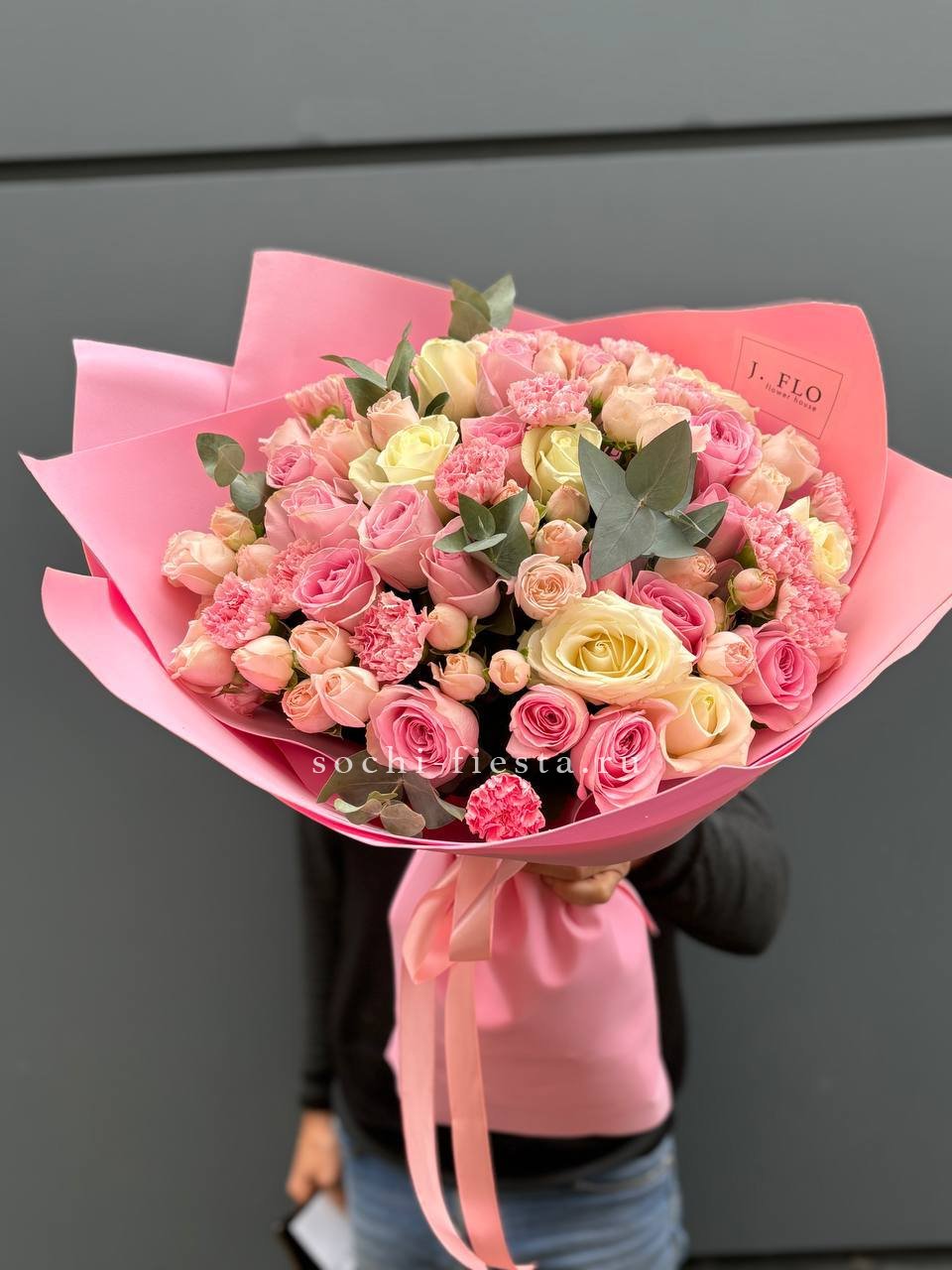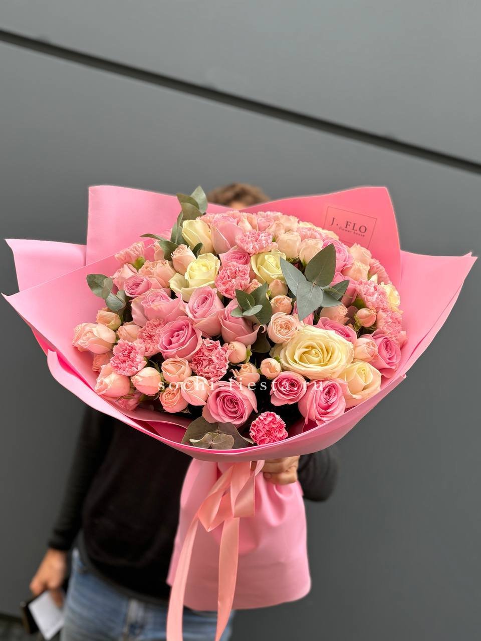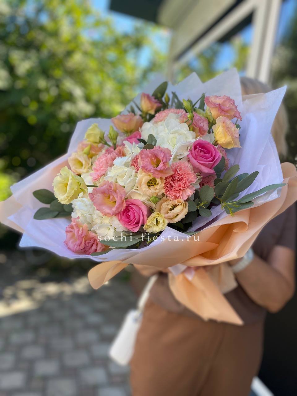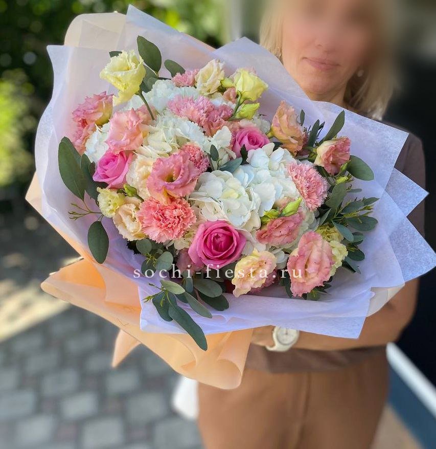 розовая роза, гортензия, диантус, эустома, эвкалипт, лента, дизайнерская упаковка.