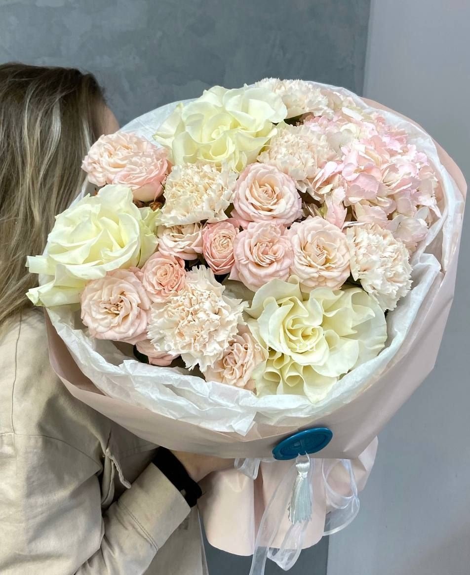 гортензия белая голландская, пионовидная роза Мисти Бабблс, оформление.