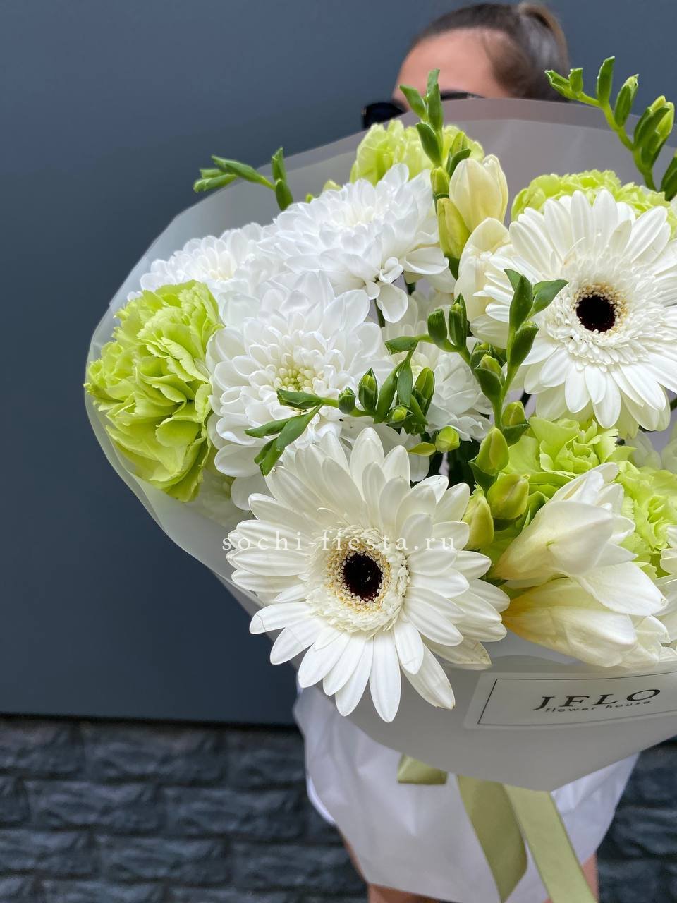 гортензия, герберы,  фрезии, диантусы, хризантемы , лента и дизайнерская пленка.