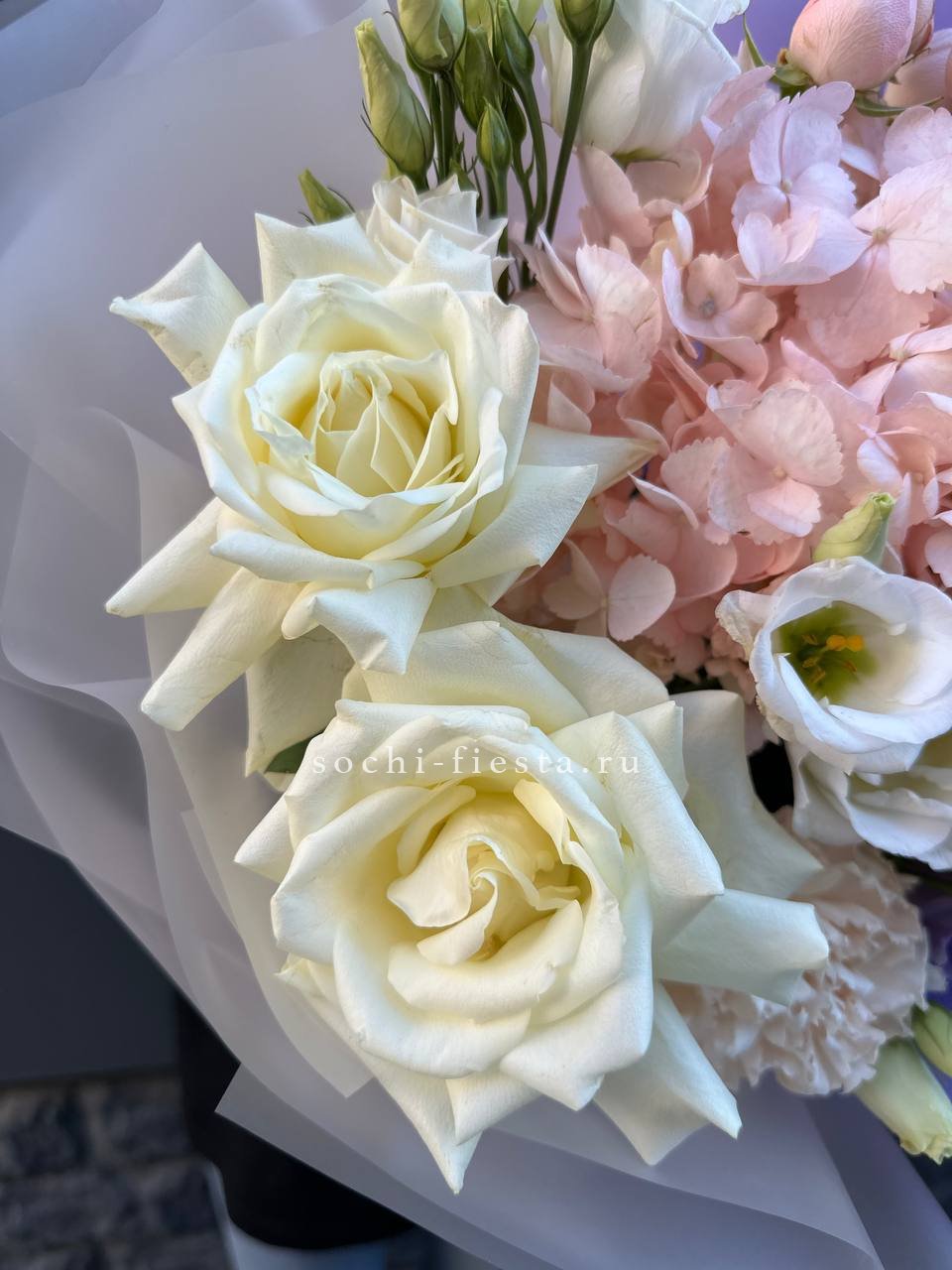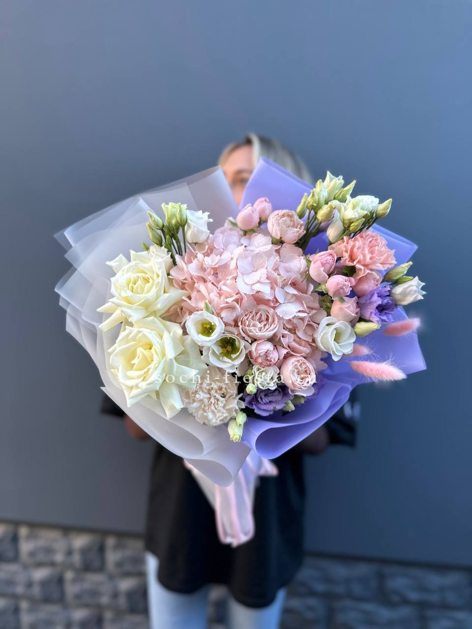 гортензия, одноголовые хризантемы, кустовые розы, альстромерии, лента и дизайнерская пленка.