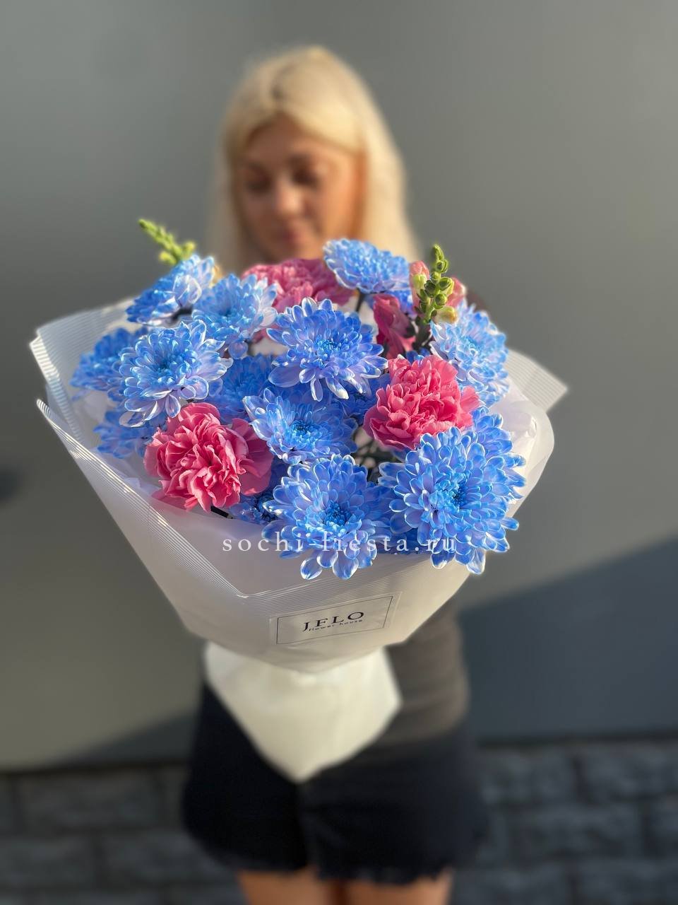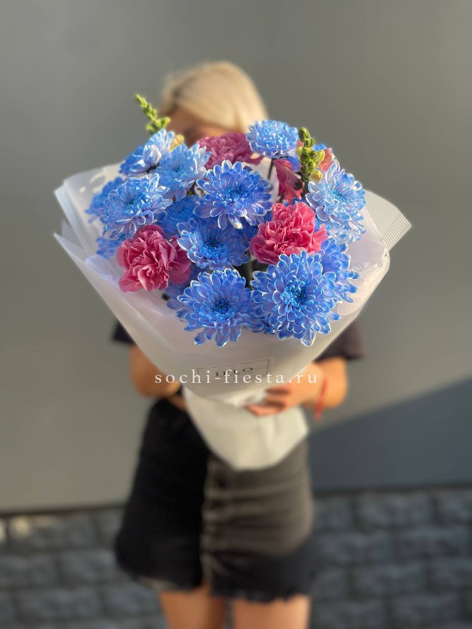 Яркий микс из хризантем, альстромерий и кустовых роз собран в плотную округлую форму. Гортензия создает объемную базу, на которой строится весь ритм композиции. Завершает образ дизайнерская упаковка с лентой в тон основной гамме.