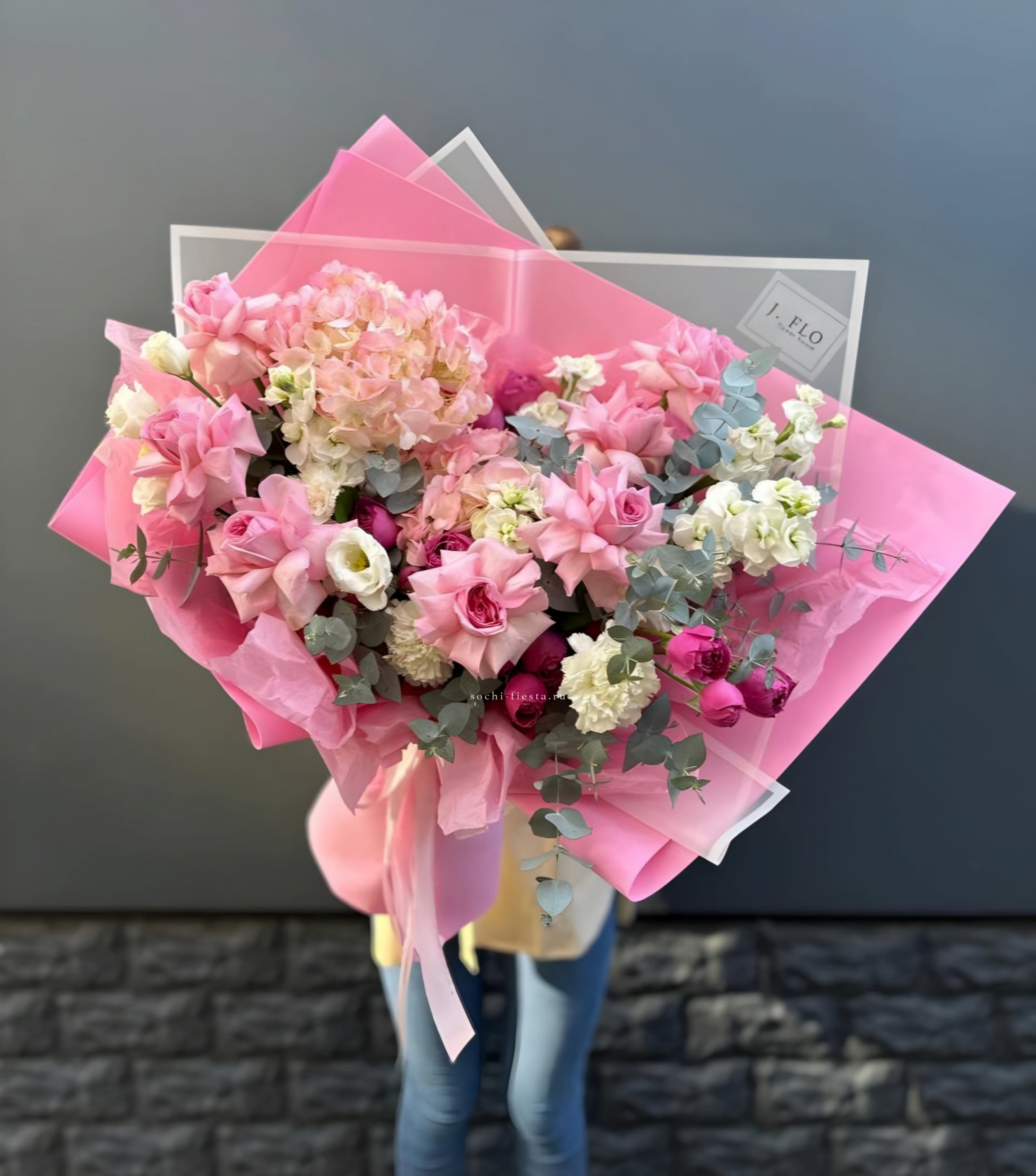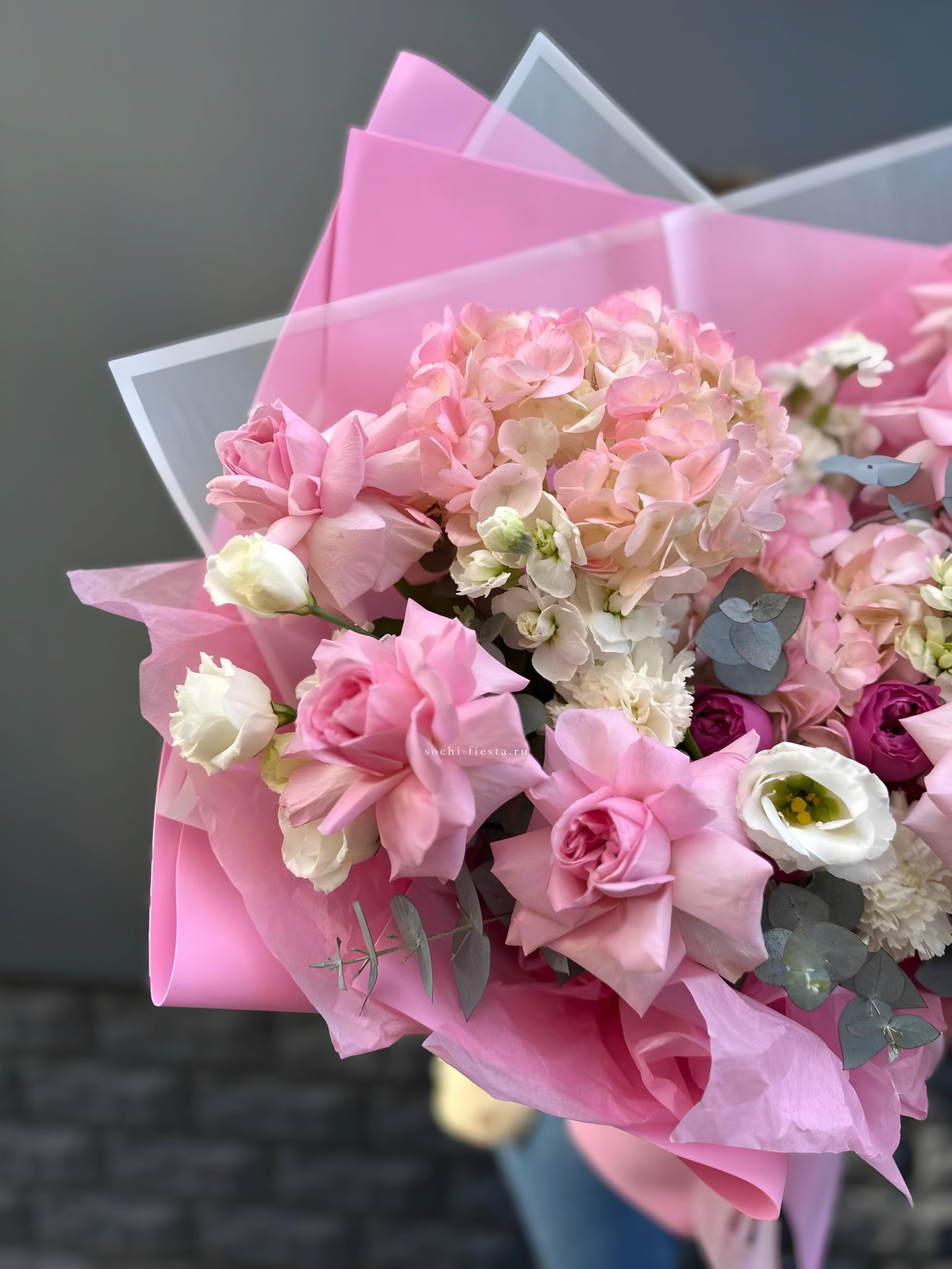 гортензия, хризантема, роза, эустома, упаковка, лента.