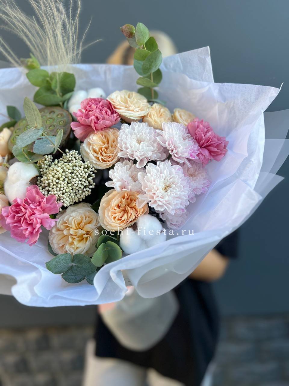 лотос, хризантема, диантус, хлопок, озатамус, пионовидная кустовая роза, эвкалипт, ковыль, оформление.