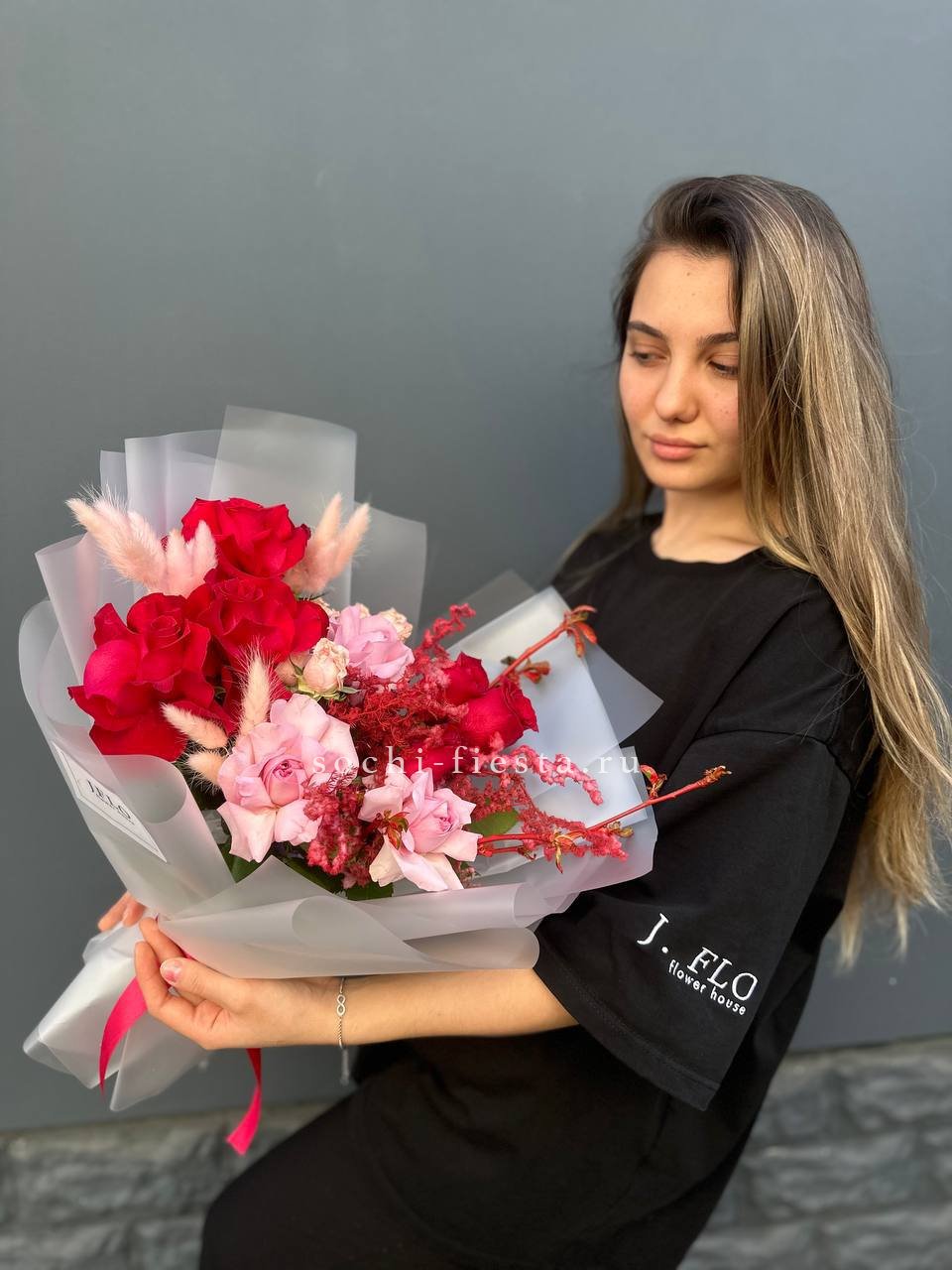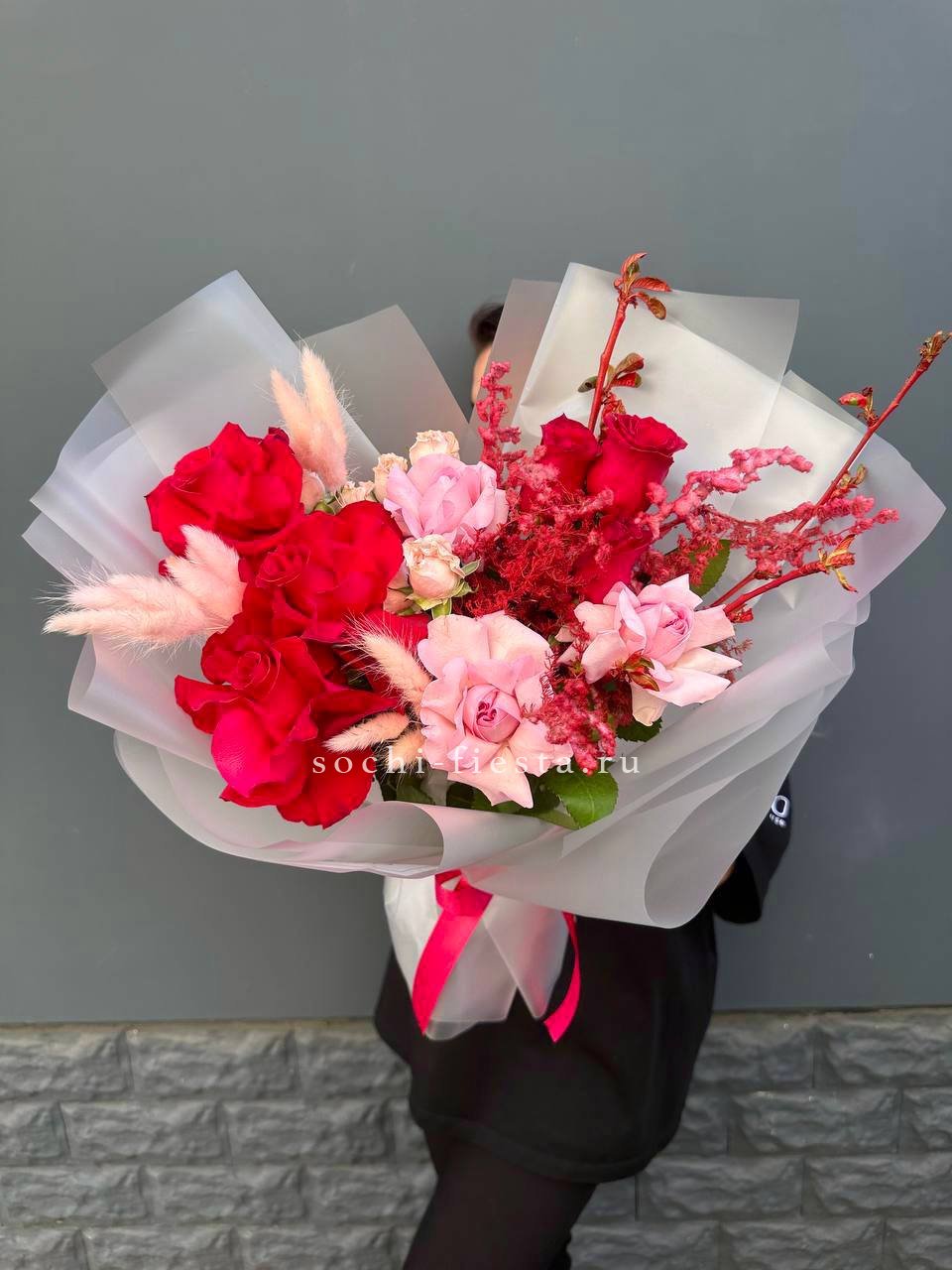 Красные и розовые оттенки переплетаются с цветущими ветками и пушистым лагурусом. Аспарагус добавляет воздушности, а кустовые розы заполняют пространство живой энергией. Букет держит форму и притягивает взгляд.