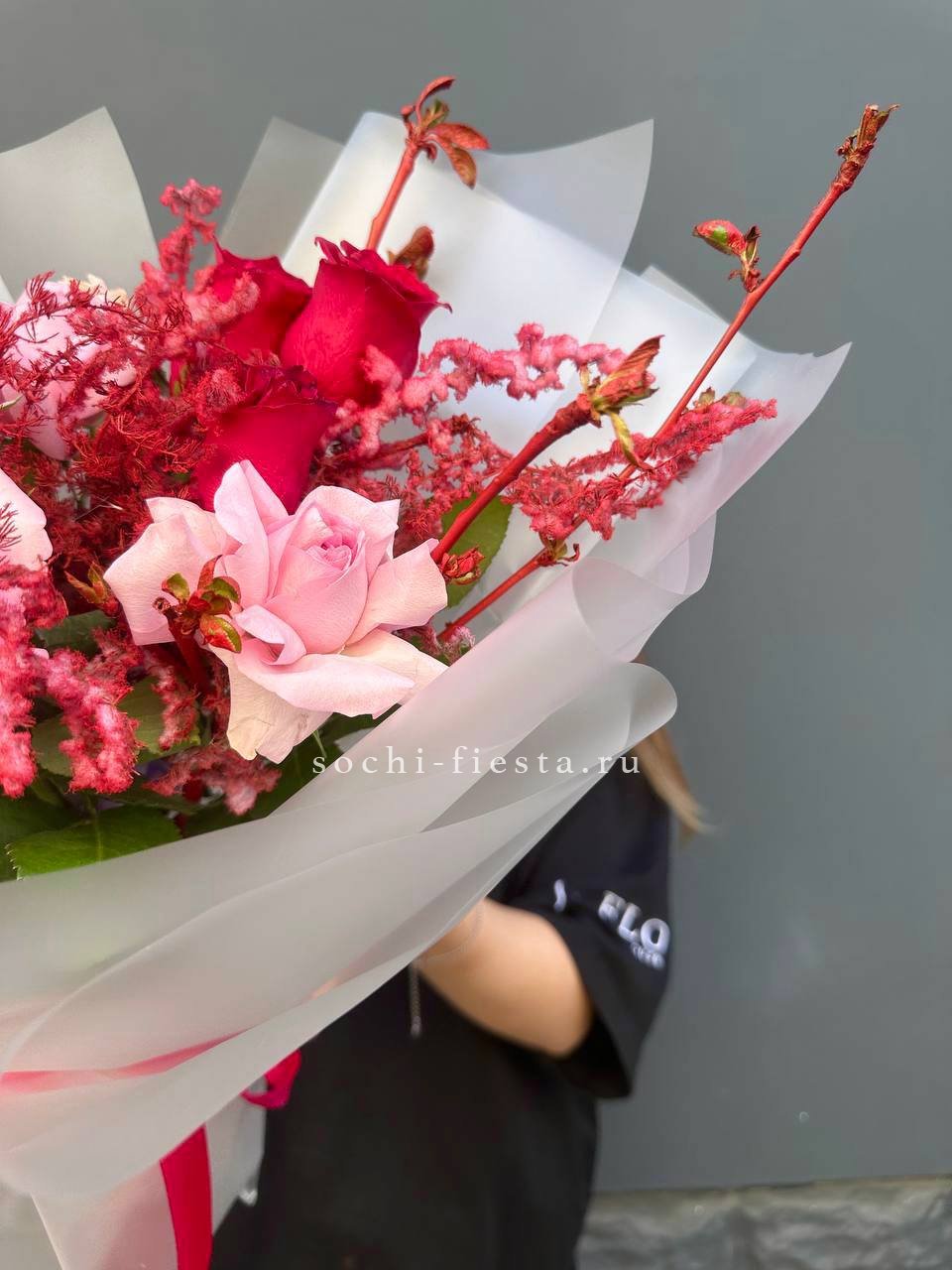 красные розы, розовые розы, аспарагус, кустовые розы, цветущие ветки, лагурус, лента, дизайнерская пленка.