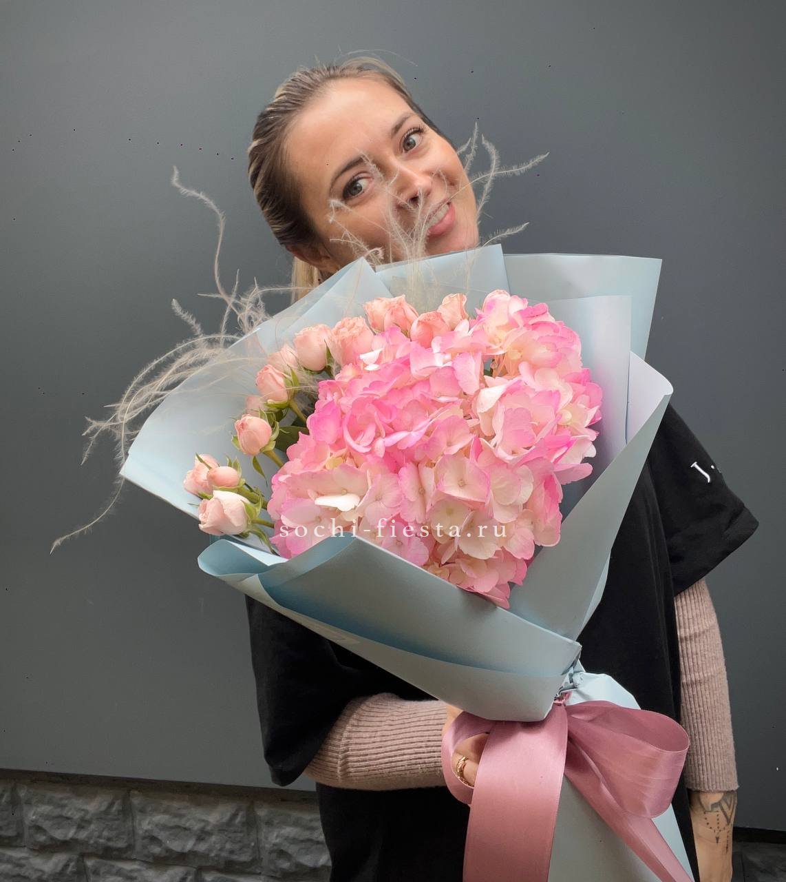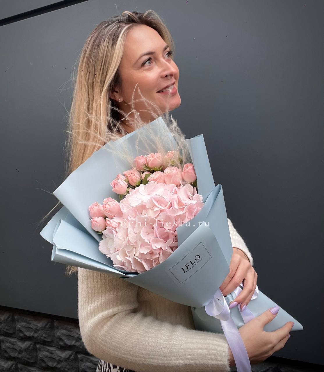 гортензия, белая роза, диантус, хризантема, эустома, озатамус, пленка.
