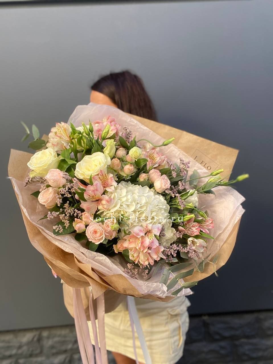 пионовидные розы, розовые пионы, диантусы, эвкалипт, лента, дизайнерская упаковка.