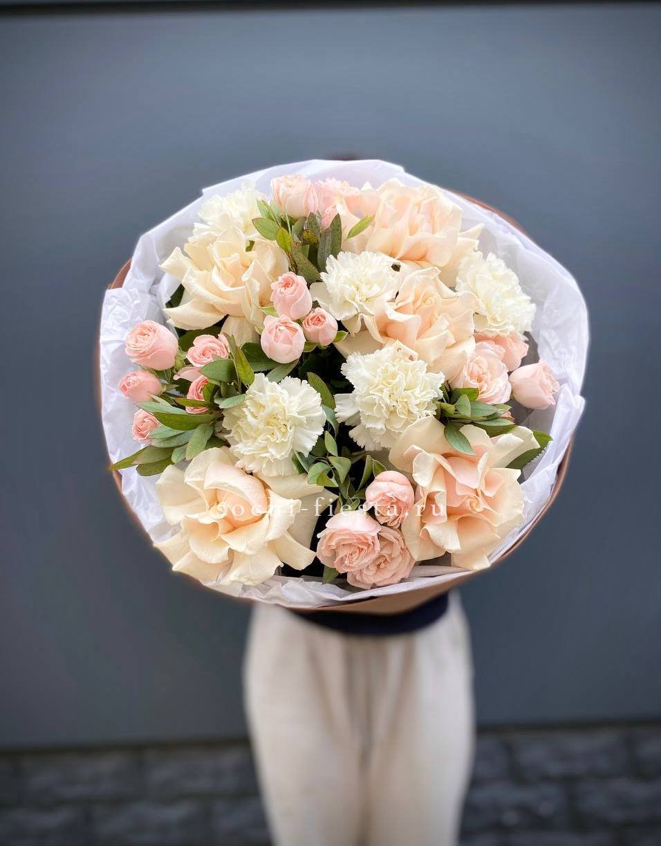 Кремовые и кустовые розы образуют спокойную цветовую гамму с тёплым подтоном. Диантусы добавляют объём, а эвкалипт вносит свежие нотки в общую картину.