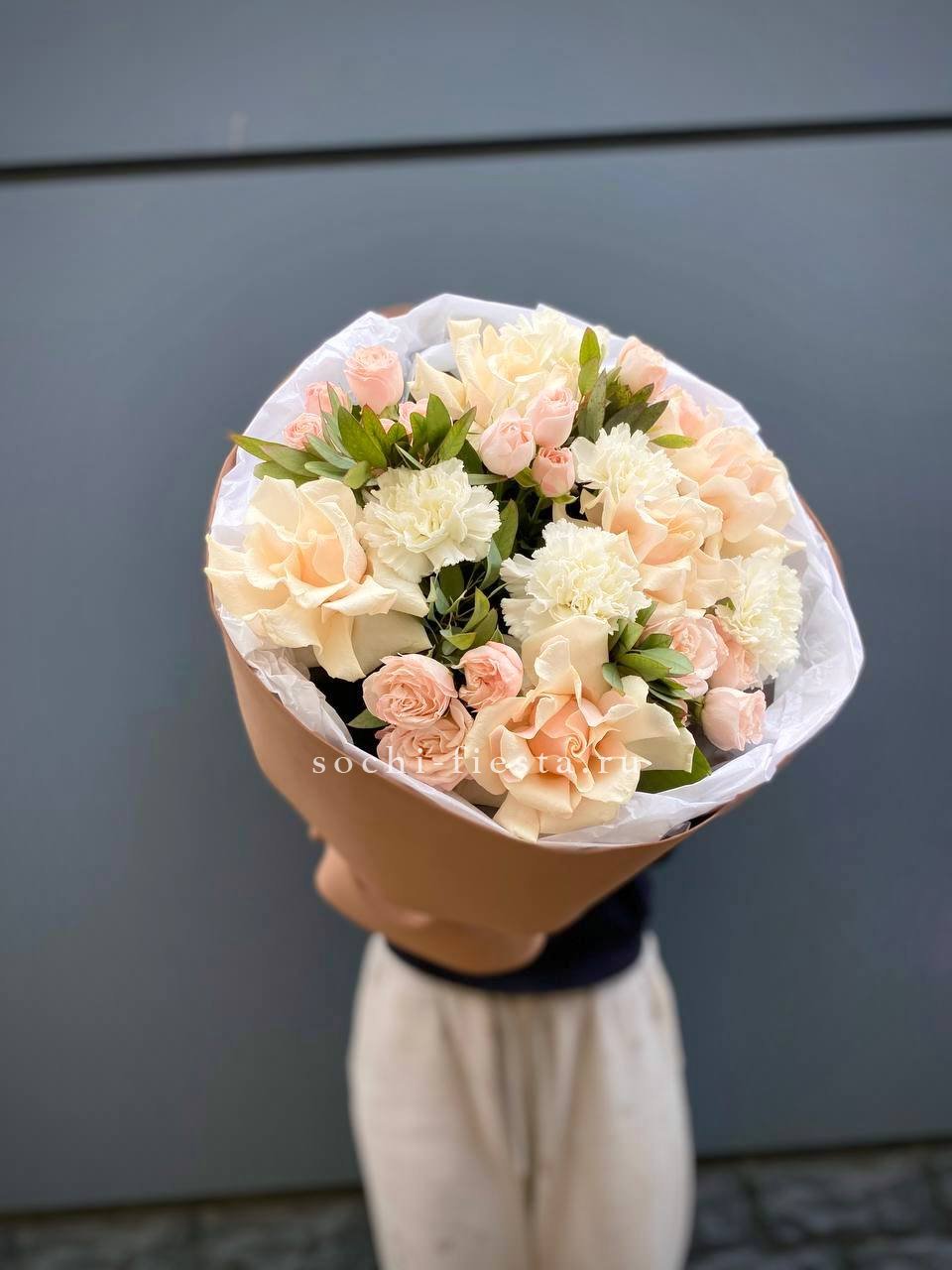 кустовые розы, кремовые розы, диантусы, эвкалипт лента и дизайнерская пленка.