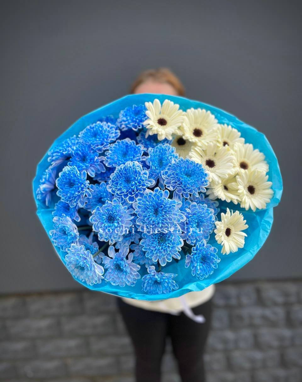 Яркие герберы встречаются с розами и хризантемами в плотной композиции. Гортензия добавляет объём, а хлопок создаёт мягкую текстурную волну по краю букета.