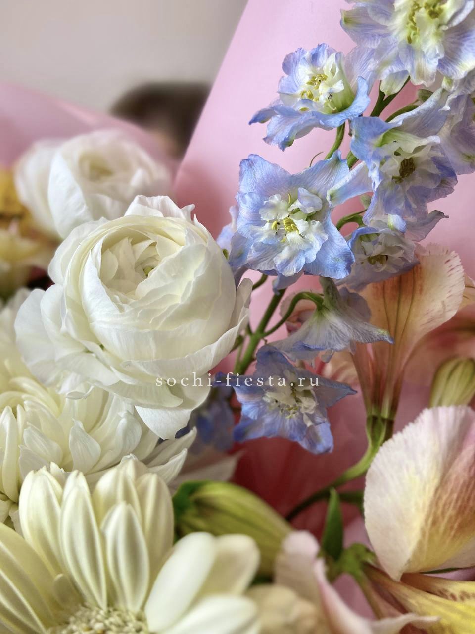 ранункулюс, гербера, альстромерия, хризантема, дельфиниум, авторское оформление.