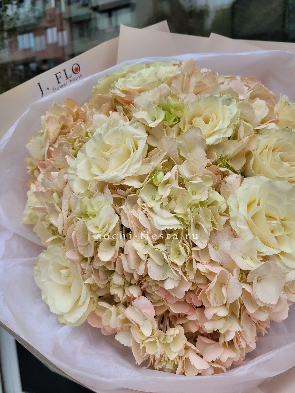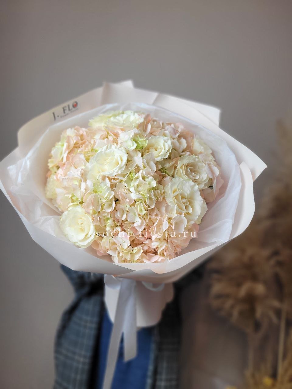 гортензия, диантус, кустовая пионовидная роза, эустома, вспомогательные цветы, эвкалипт, лента, дизайнерская упаковка.