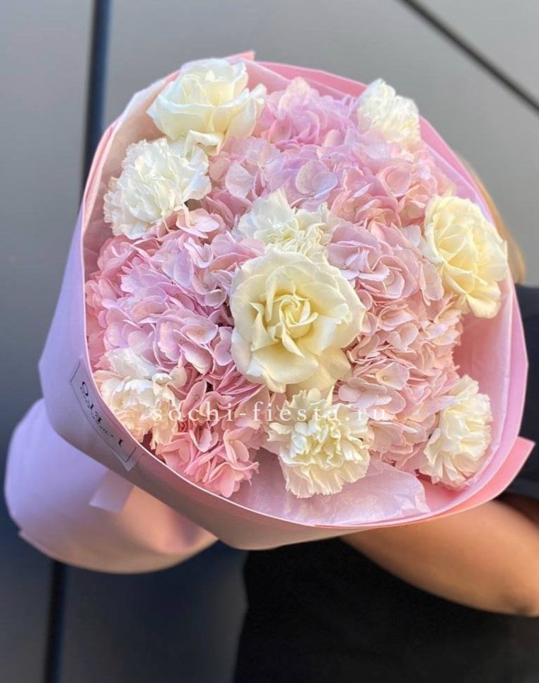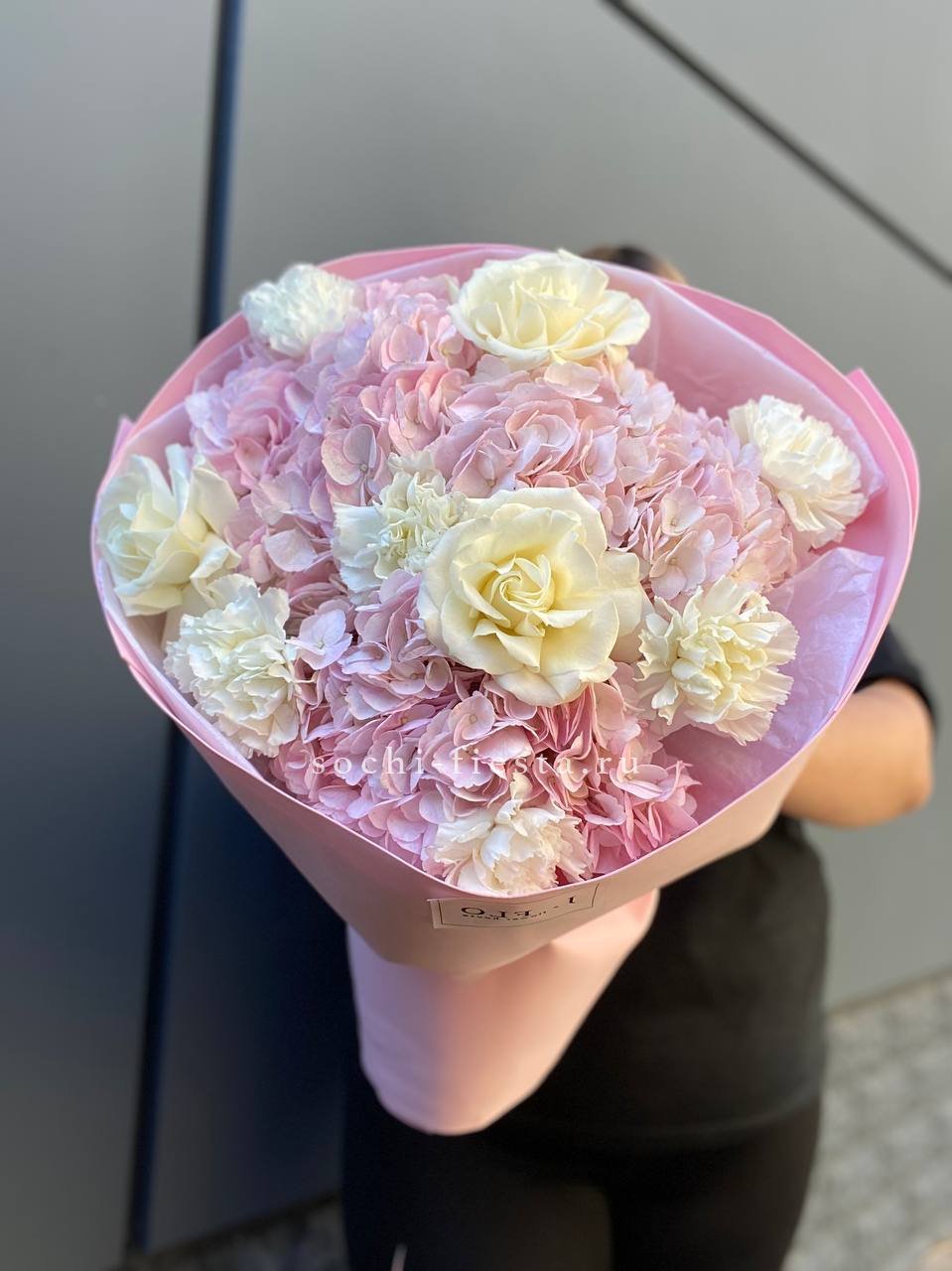 Светло-розовая палитра раскрывается от пудровых роз до свежих гербер. Бруния и аспарагус добавляют фактурные детали, а гортензия мягко завершает цветовую гамму.