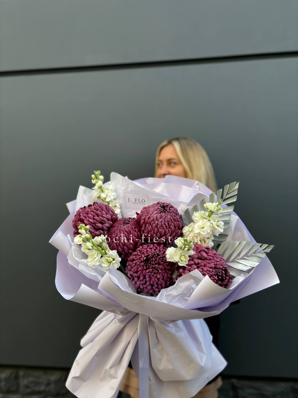 Графичные соцветия бигуди встречаются с воздушной маттиолой в неожиданном дуэте. Листья чики или эвкалипт расставляют акценты и создают глубину между яркими формами.