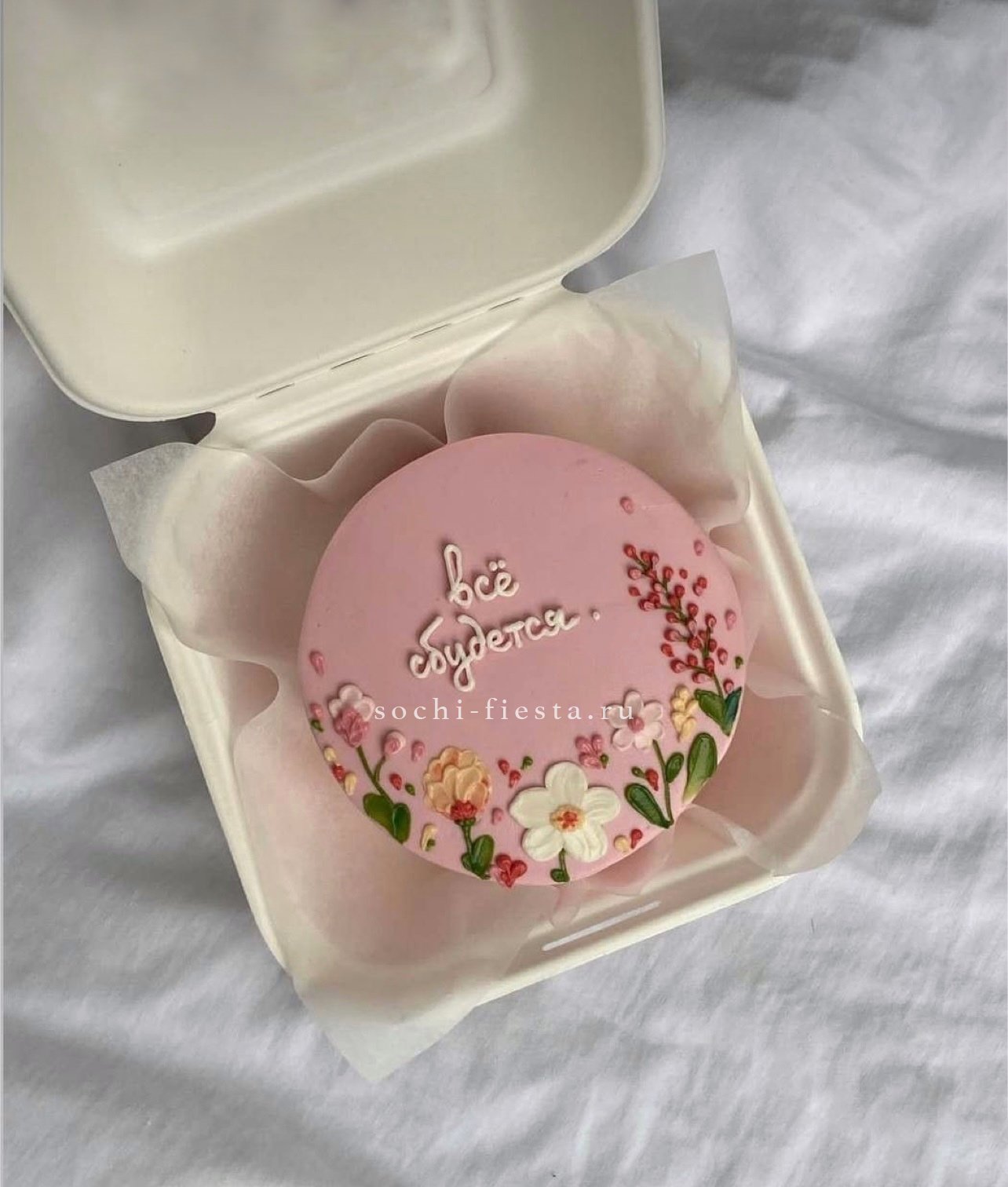 Светлая поверхность с мазками крема и декором в виде бабочек создаёт летнее настроение. Торт сочетает воздушность формы и плотность начинки на выбор из трёх вкусов.
